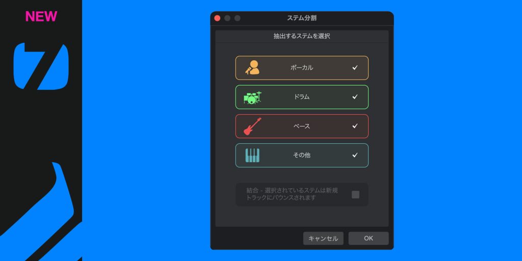 AIを駆使したステム分割で無限の可能性の世界へ!最も要望の多い機能のひとつであるステム分割が、タイムライン上で直接利用できるようになりました。AIベースのStudio Oneのステム分割アルゴリズムは、2ミックスされたオーディオ・イベントをボーカル、ドラム、ベース、コードに分離し、これらの要素をフォルダー・トラック内の新規トラックに追加します。